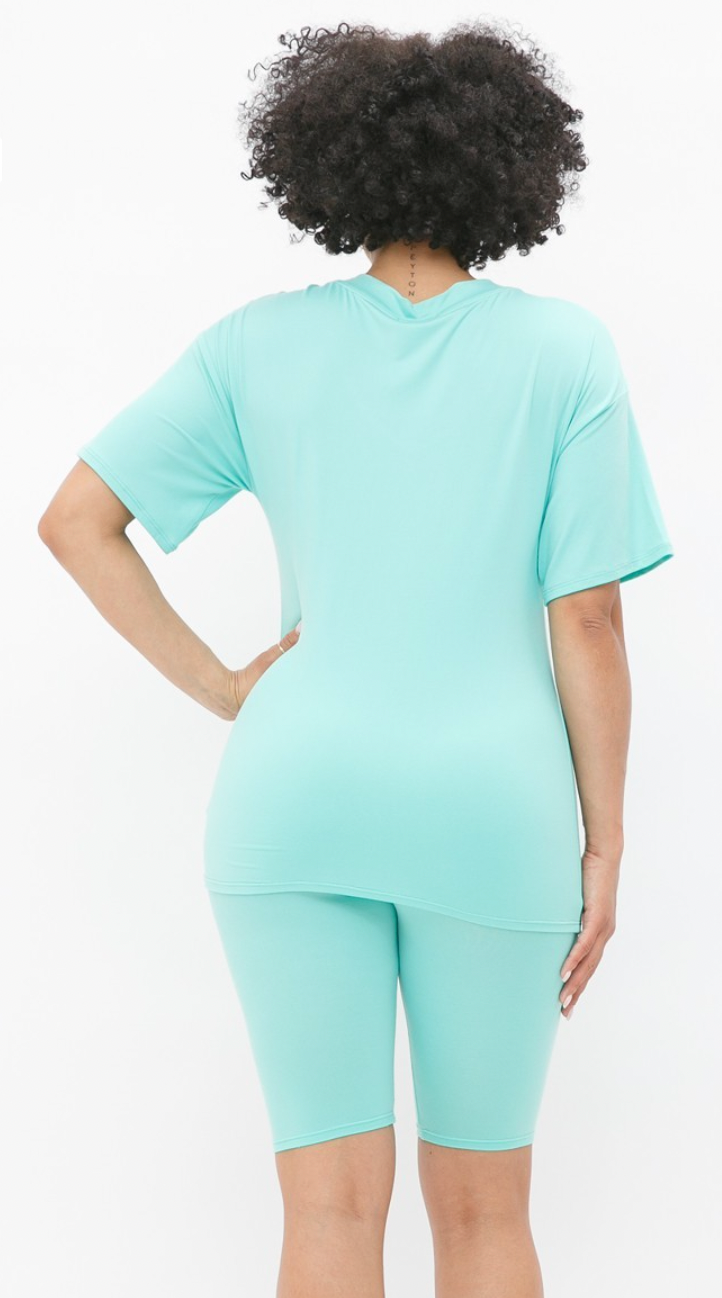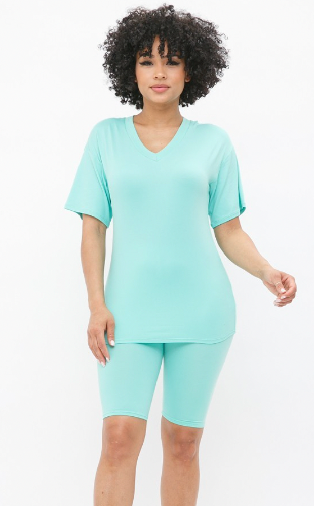 "TEAL TWO PIECE BIKER SET PLUS SIZE" features a V-neck design, short sleeve top and above the knee comfy biker shorts.