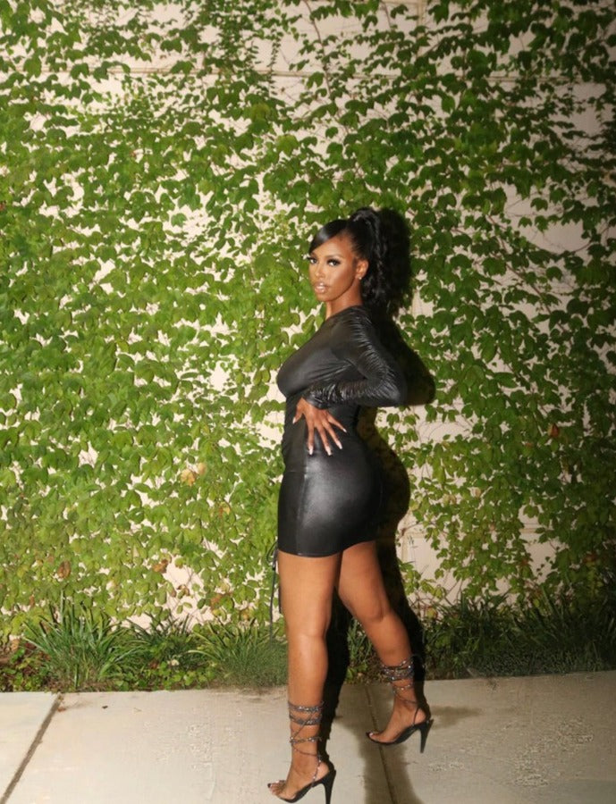 This BLACK LEATHER MINI DRESS from is crafted from 100% vegan leather and features a stretchy, form fitting silhouette. The flattering mini style is finished with an adjustable ruching tie, ensuring a comfortable and perfect fit.